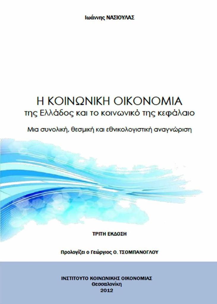 Η Κοινωνική Οικονομία της Ελλάδος και το κοινωνικό της κεφάλαιο Μια συνολική, θεσμική και εθνικολογιστική αναγνώριση. Του Ιωάννη ΝΑΣΙΟΥΛΑ. Προλογίζει ο Γεώργιος ΤΣΟΜΠΑΝΟΓΛΟΥ. Έκδοση Γ, αναθεωρημένη & συμπληρωμένη. Ινστιτούτο Κοινωνικής Οικονομίας. 2012/2014/2016. ISBN: 978-618-80232-0-8. Σελίδες: 250.
