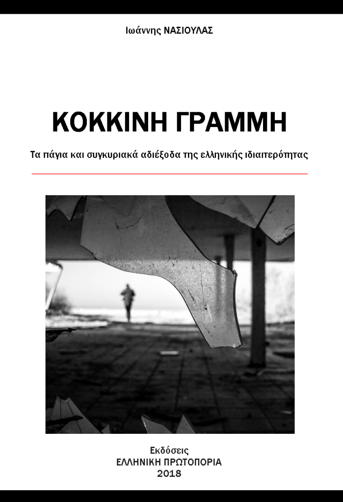 ΚΟΚΚΙΝΗ ΓΡΑΜΜΗ – Τα πάγια και συγκυριακά αδιέξοδα της ελληνικής ιδιαιτερότητας. Ιωάννης ΝΑΣΙΟΥΛΑΣ. Ελληνική Πρωτοπορία. 2018. ISBN: 978-618-80274-8-0