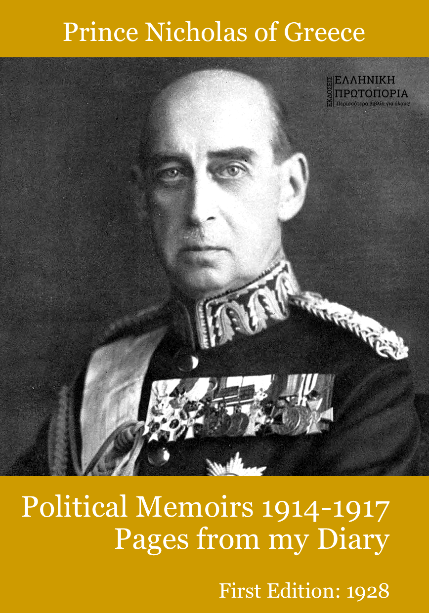 Political Memoirs 1914-1917. Pages from my Diary. Prince Nicholas of Greece and Denmark. First Edition: HUTCHINSON AND CO., LONDON, 1928. Present Edition: GRECOBOOKS – ΕΚΔΟΣΕΙΣ ΕΛΛΗΝΙΚΗ ΠΡΩΤΟΠΟΡΙΑ, 2025. Pages: 348. ISBN: 978-618-5383-65-7